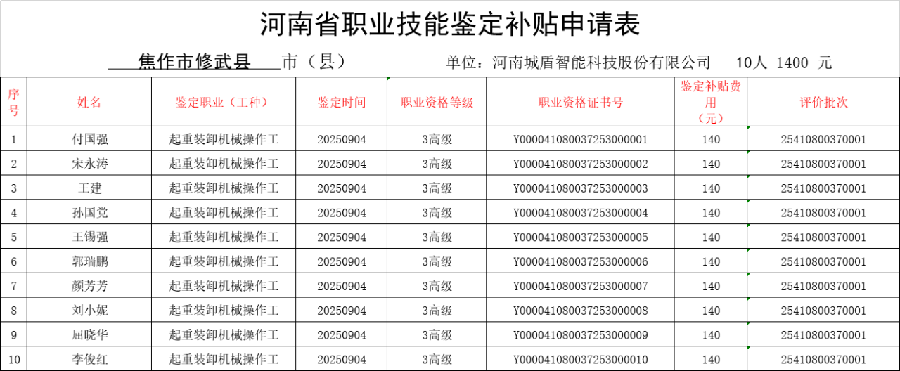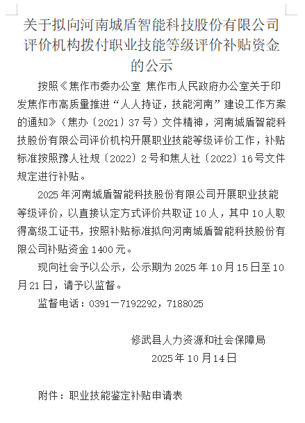 关于拟向河南城盾智能科技股份有限公司评价机构拨付职业技能等级评价补贴资金的公示