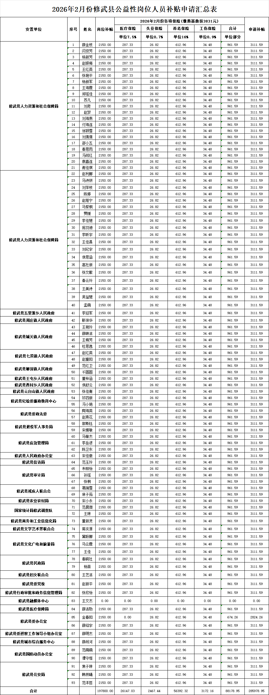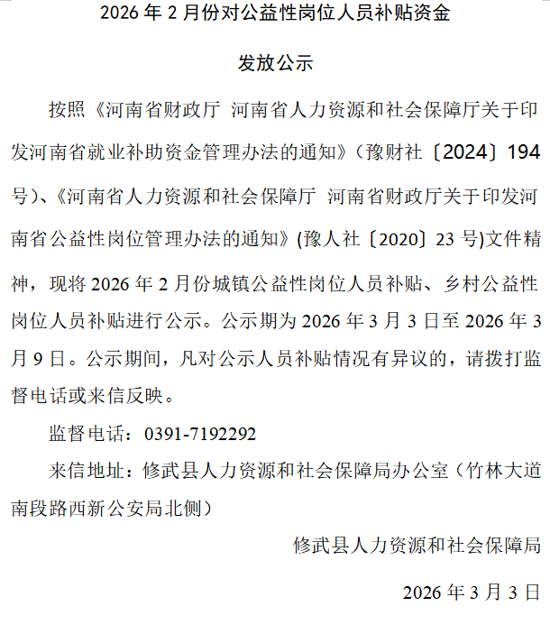 2026年2月份对公益性岗位人员补贴资金发放公示